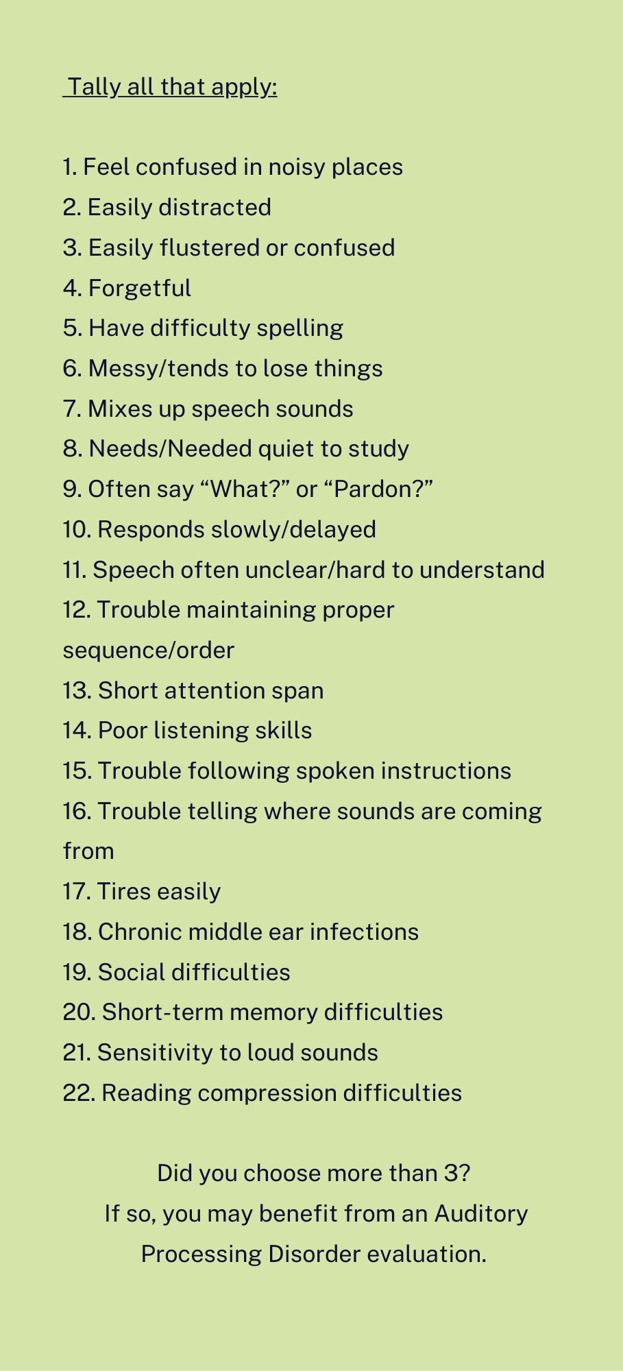 An auditory processing evaluation must be completed to determine if you have APD and what type(s).