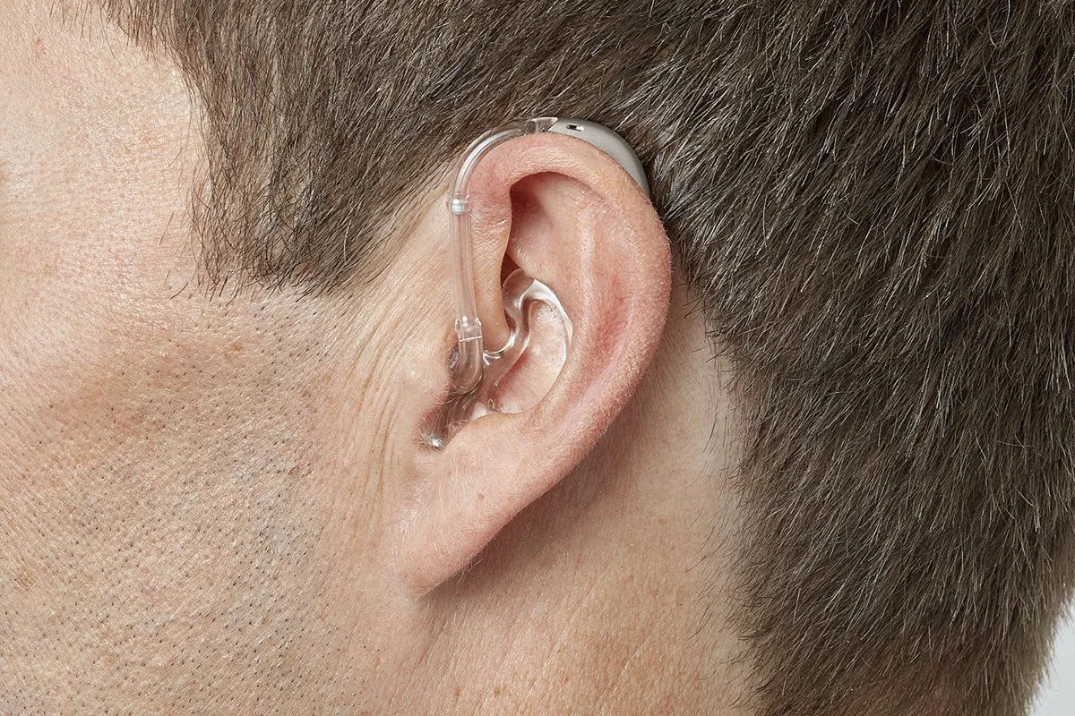 BTE hearing aids sit behind the ear and have a tube that connects the body of the hearing aid to a custom earmold. This style is chosen mostly for children, hearing losses that require more power, and for those with dexterity limitations.